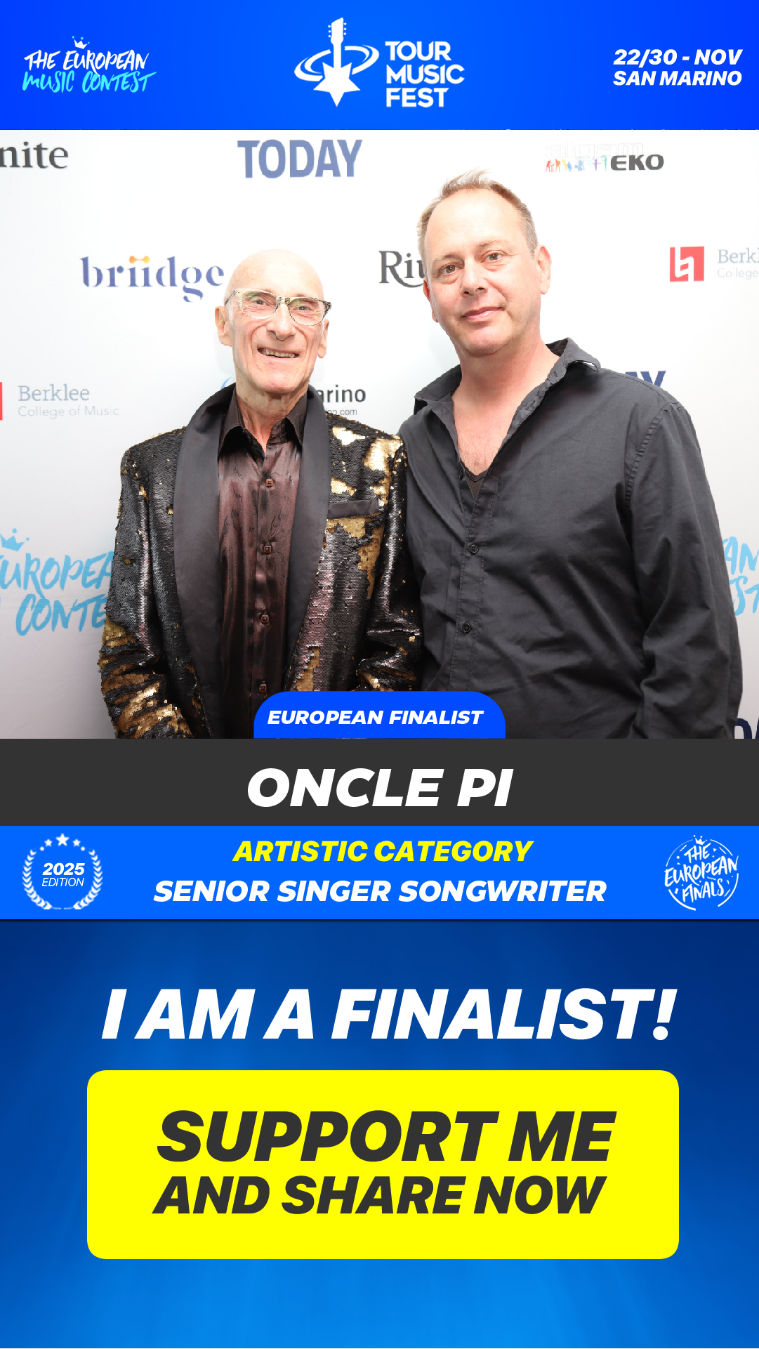Parmi plus de 28 000 artistes venus de toute l’Europe sélectionnés lors de la tournée d’auditions en direct, qui a fait étape dans 13 pays européens, ONCLE Pi, 75 ans, accompagné de son pianiste Jakub Groos, a déjà franchi une étape importante le 6 septembre dernier à Genève avec sa chanson « Papa ». Cette qualification lui donnera ainsi l’occasion de se produire sur une scène très convoitée en Europe et de remporter pourquoi pas un des prix comme une bourse d’études au Berklee College of Music de Boston, la production d’un single offerte par le sponsor Riunite, le vin Lambrusco le plus consommé au monde, ou un contrat de sponsoring d’une valeur de 10 000 euros à investir dans sa propre musique.